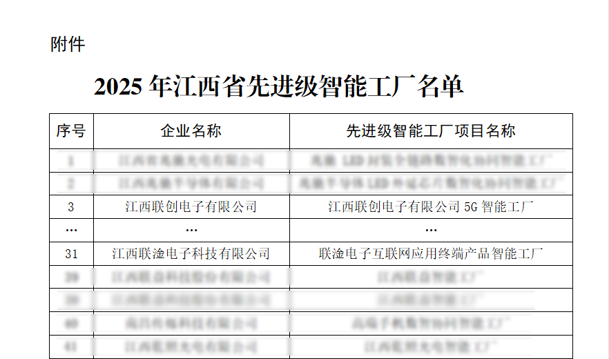 近日,江西省工业和信息化厅正式公布2025年江西省“先进级智能工厂”名单,186家企业入选。其中ld体育(中国)登录入口,、江西联淦电子科技有限公司2家联创电子系企业名列榜单。这标志着公司在智能制造领域的创新成果再次获得政府权威认可。
